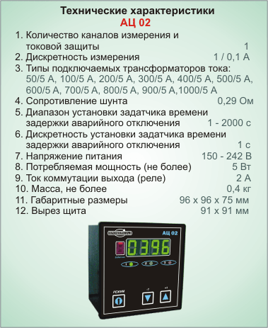 Амперметр цифровой АЦ-02 предназначен для токовой защиты электрооборудования, потреблением от 1 А до 1000 А. Прибор имеет выход для отключения оборудования при превышении заданного аварийного значения силы тока, а также задатчик времени задержки отключения. Предусмотрен, также, задатчик времени задержки отключения электроустановки при первой подаче электропитания, для предотвращения ложного аварийного отключения от "пусковых токов". В качестве датчиков используются стандартные трансформаторы тока. Диапазон из- мерения силы тока устанавливается потребителем с помощью кнопок прибора. |